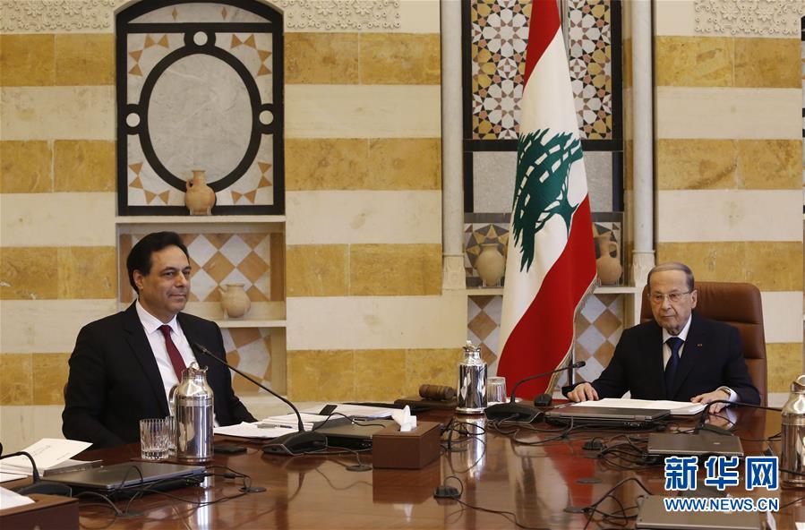1月22日,在位于黎巴嫩首都贝鲁特东南的总统府,黎巴嫩总统米歇尔·奥恩(右)和新任总理哈桑·迪亚卜出席新内阁第一次会议。 以哈桑·迪亚卜为总理的新一届内阁21日组建完成,新内阁首次会议于22日举行。 新华社发(比拉尔·贾维希摄)
