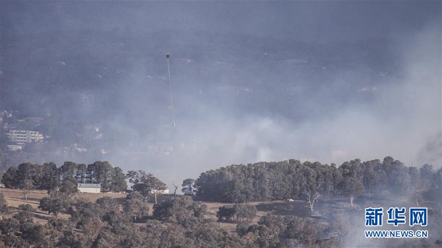 1月22日,在澳大利亚堪培拉机场附近,一架直升机参与扑救林火。 澳大利亚首都堪培拉机场附近与昆比恩交界处22日下午发生林火。 新华社发(刘畅畅摄)