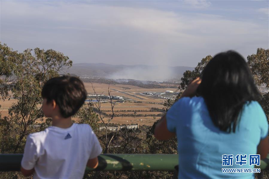 1月22日,在澳大利亚堪培拉机场附近,人们望着林火产生的浓烟。 澳大利亚首都堪培拉机场附近与昆比恩交界处22日下午发生林火。 新华社发(刘畅畅摄)