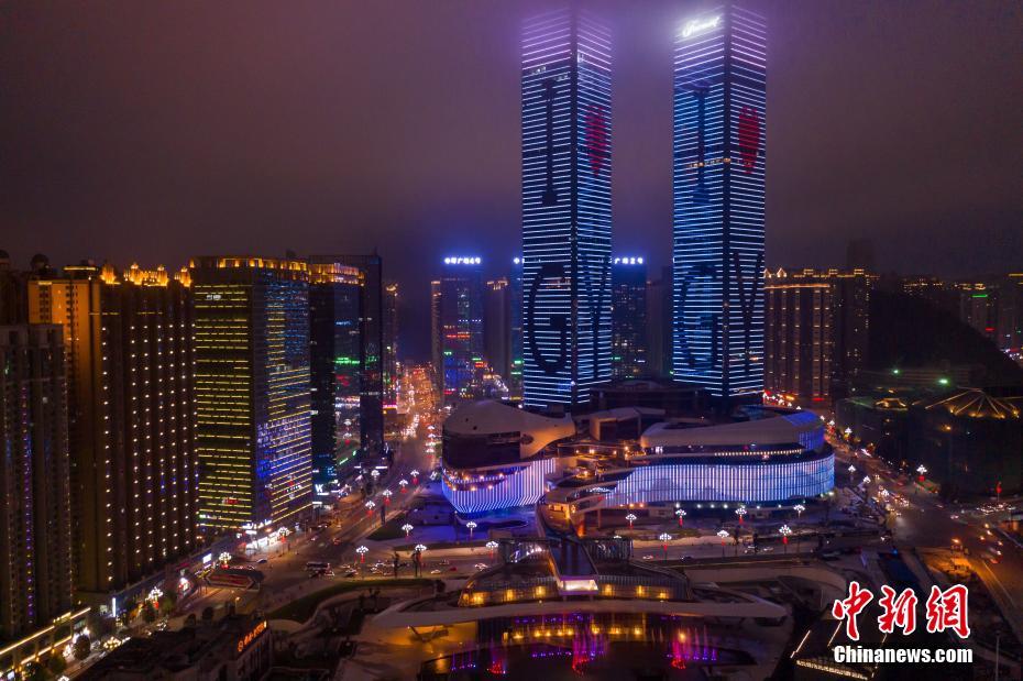 1月22日,贵阳市花果园双子塔上演春节定制版灯光秀,吸引市民观赏。中新社发 贺俊怡 摄