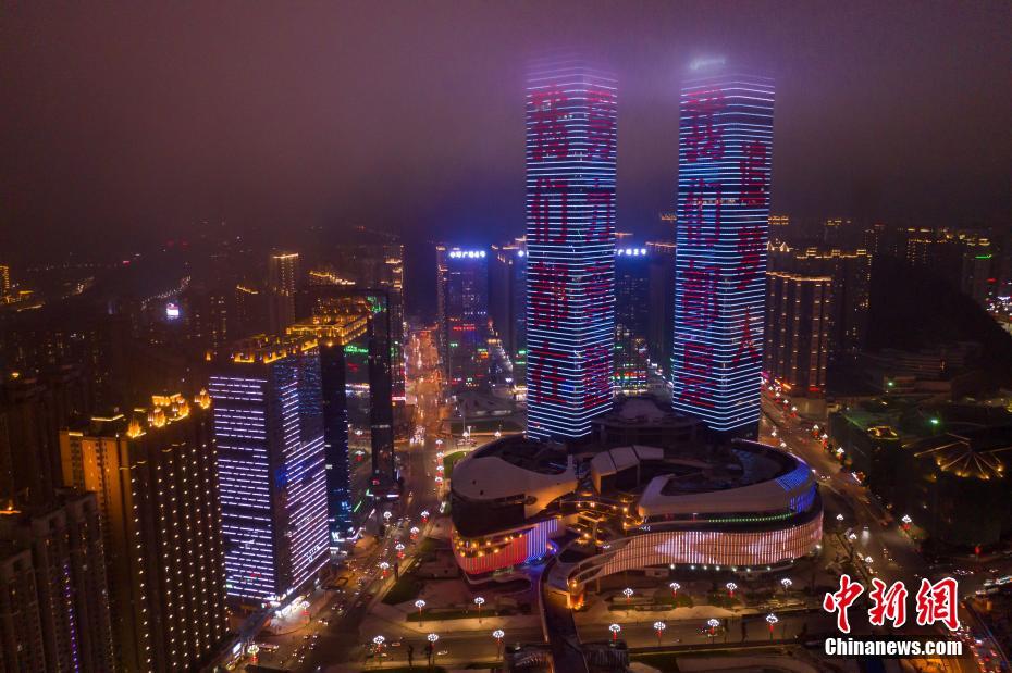 1月22日,贵阳市花果园双子塔上演春节定制版灯光秀,吸引市民观赏。中新社发 贺俊怡 摄
