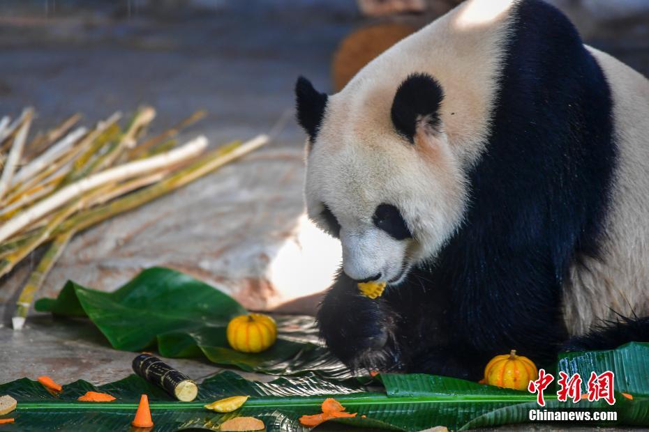 海南大熊猫兄弟“贡贡”“舜舜”吃“饺子”过大年