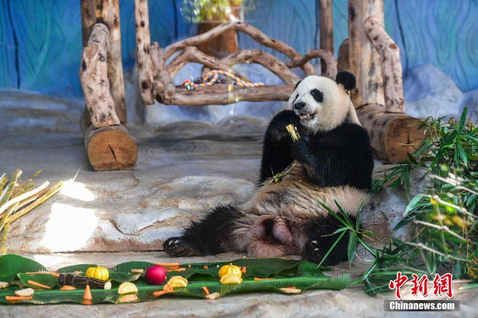 海南大熊猫兄弟“贡贡”“舜舜”吃“饺子”过大年