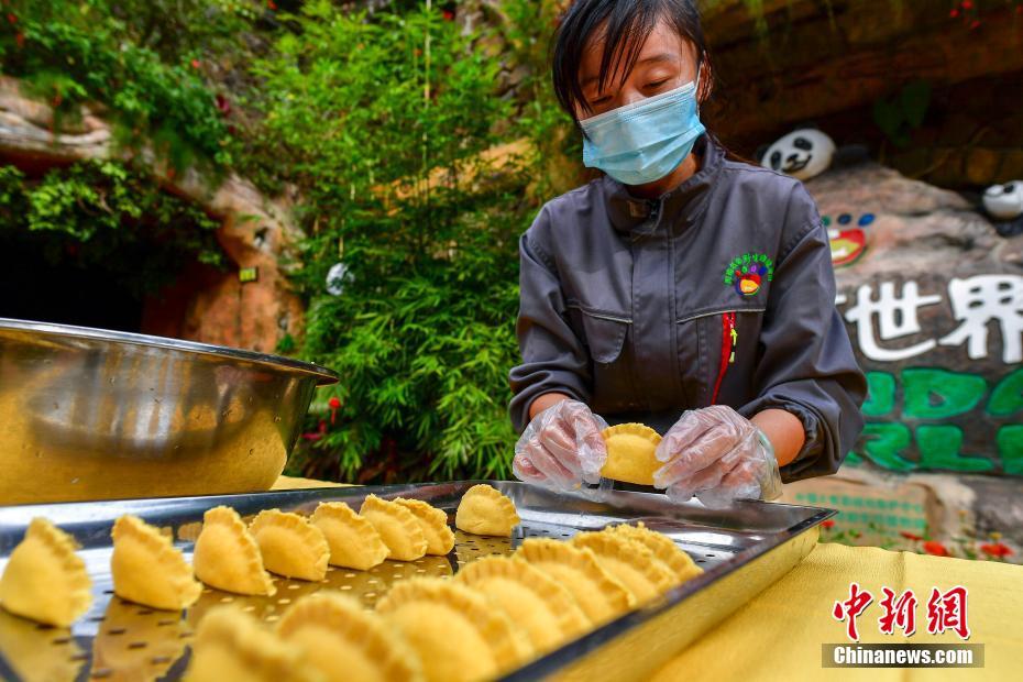海南热带野生动植物园的工作人员为大熊猫兄弟制作“饺子”。骆云飞 摄
