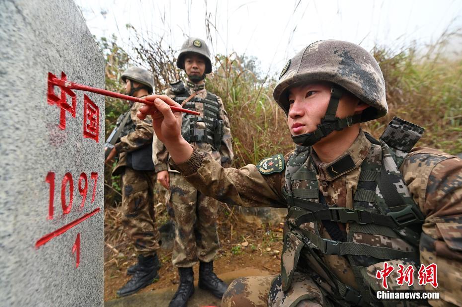 1月20日,“00后”新兵曾森洲为界碑描红。中新社记者 俞靖 摄