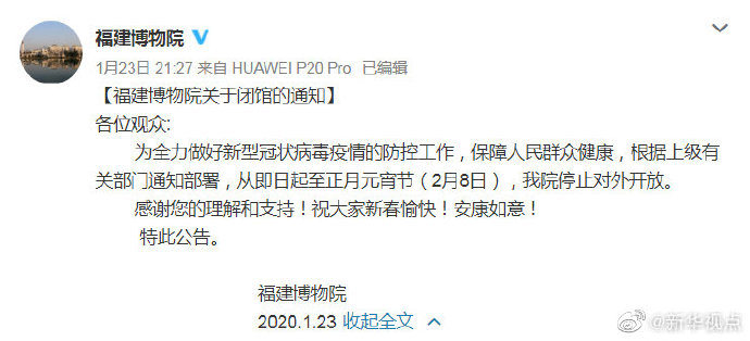 福建博物院官方微博发布消息称,为全力做好新型冠状病毒疫情的防控工作,保障人民群众健康,根据上级有关部门通知部署,从即日起至正月元宵节(2月8日),福建博物院停止对外开放。