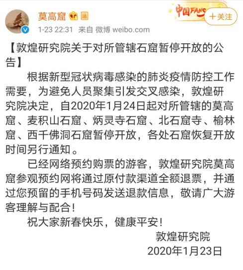敦煌研究院莫高窟官方微博@莫高窟 23日发布公告:根据新型冠状病毒感染的肺炎疫情防控工作需要,为避免人员聚集引发交叉感染,敦煌研究院决定,自2020年1月24日起对所管辖的莫高窟、麦积山石窟、炳灵寺石窟、北石窟寺、榆林窟、西千佛洞石窟暂停开放,各处石窟恢复开放时间另行通知。