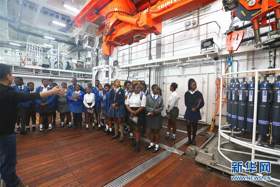 这是“雪龙2”号第三次穿越西风带,第二次前往南极地区。在开普敦停靠期间,“雪龙2”号完成了人员更换和燃油、淡水、食品补给,还接待了南非环境部组织的当地百名中学生上船参观。图为1月22日,科考队员为开普敦中学生讲解“雪龙2”号科考设备。 新华社记者 刘诗平 摄
