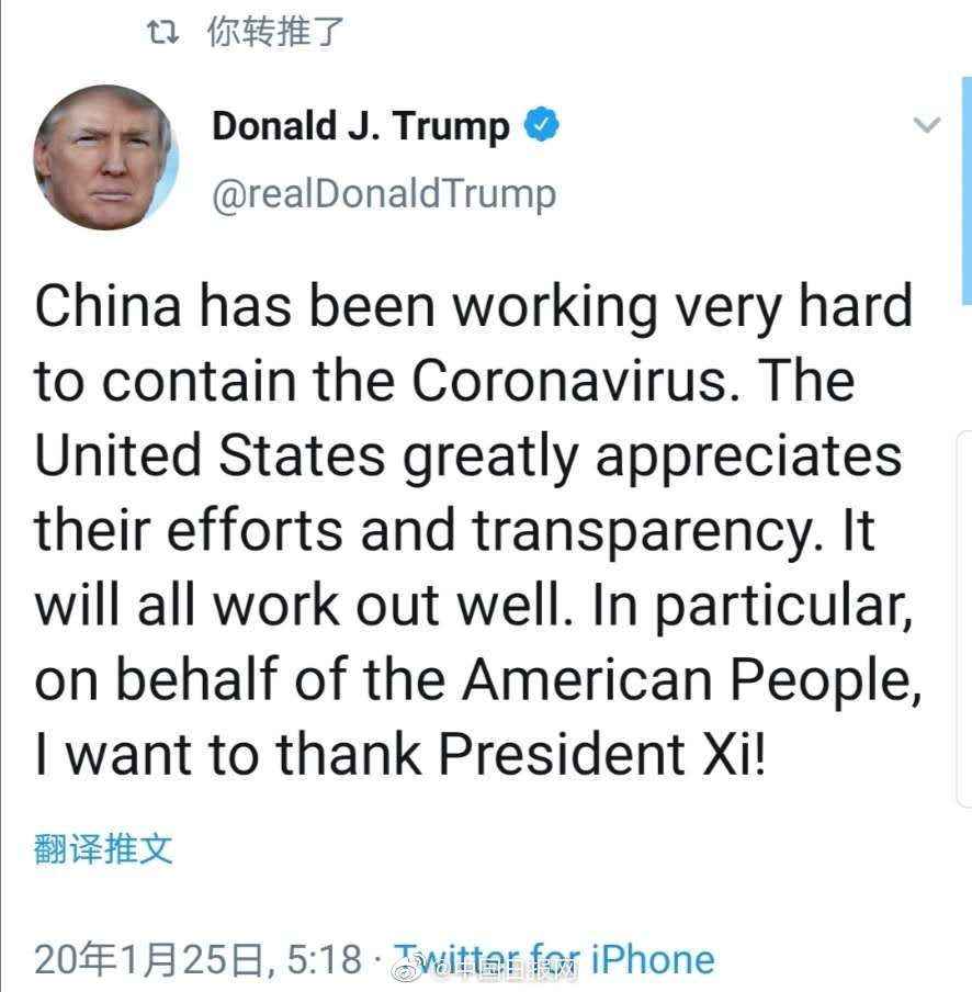 据中国日报网消息,刚刚,美国总统特朗普发推特表示,中国正在尽力遏制新型冠状病毒,美国非常欣赏他们的努力和透明性。问题将会得到解决。我要特别代表美国人民感谢习主席。