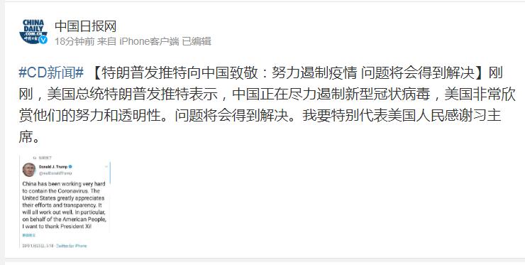 特朗普发推特向中国致敬:努力遏制疫情 问题将会得到解决
