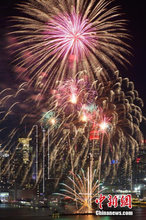 当地时间1月23日晚,纽约哈德逊河上空燃放焰火、帝国大厦点亮红色彩灯,庆祝中国春节。中新社记者 廖攀 摄