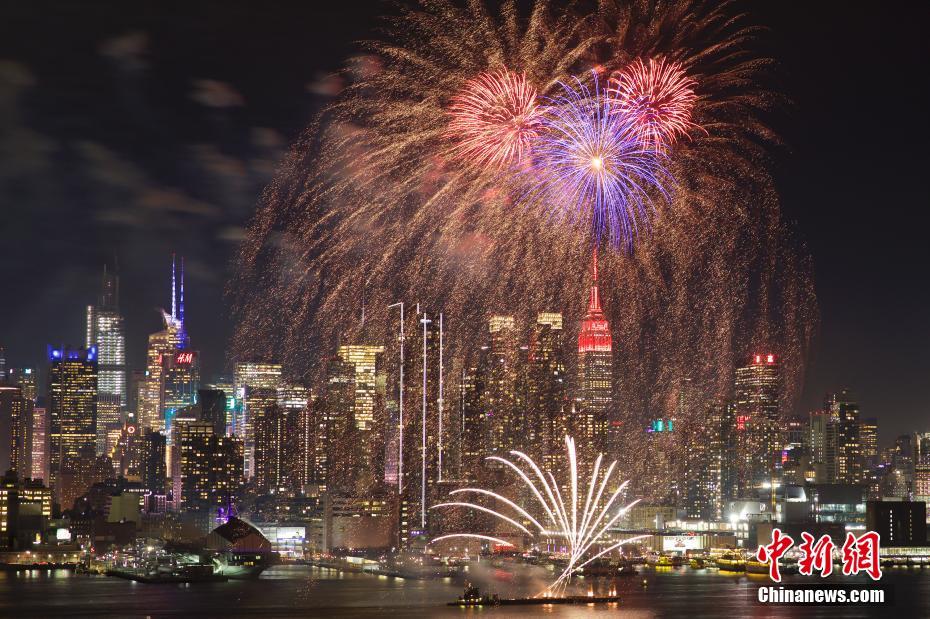 当地时间1月23日晚,纽约哈德逊河上空燃放焰火、帝国大厦点亮红色彩灯,庆祝中国春节。中新社记者 廖攀 摄