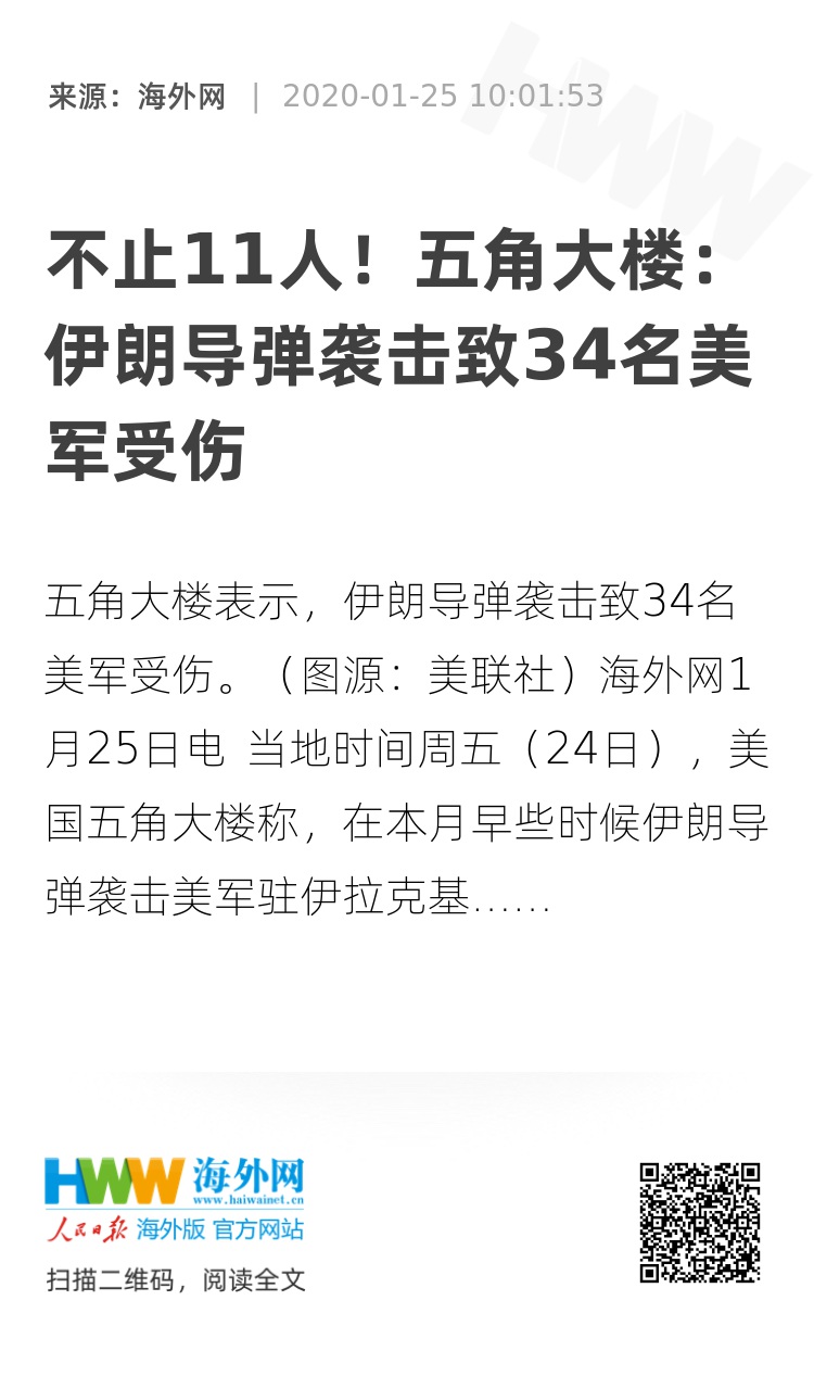 海外网1月25日电 当地时间周五(24日),美国五角大楼称,在本月早些时候伊朗导弹袭击美军驻伊拉克基地后,有34名美国军人被诊断出创伤性脑损伤。此前,五角大楼曾表示并无美军受伤,之后又改口称有11人出现脑震荡等症状。