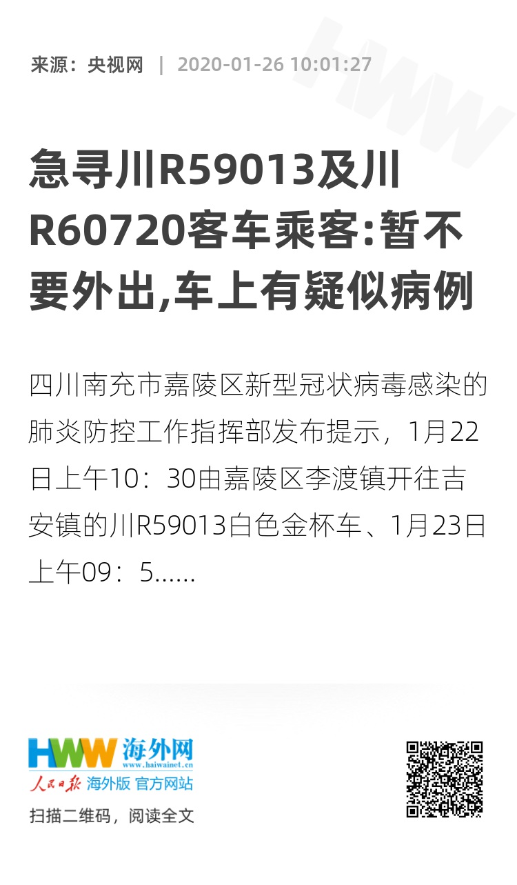 四川南充市嘉陵区新型冠状病毒感染的肺炎防控工作指挥部发布提示,1月22日上午10:30由嘉陵区李渡镇开往吉安镇的川R59013白色金杯车、1月23日上午09:57由南充开往武胜县烈面镇的川R60720客车上,发现有同一名从武汉回乡的人员孙某(男性,57岁,嘉陵区吉安镇介顶寺村人),现为新型冠状病毒感染的肺炎疑似病例。