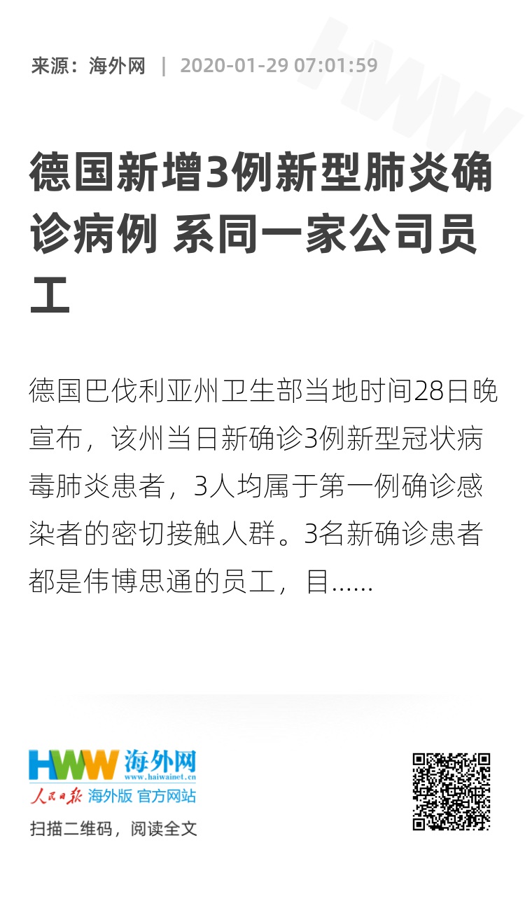 巴伐利亚州卫生部发言人表示,目前尚不清楚3名新确诊患者究竟是被第一例确诊患者感染,还是与第一例感染者一样,是被携带病毒的中国同事所感染。