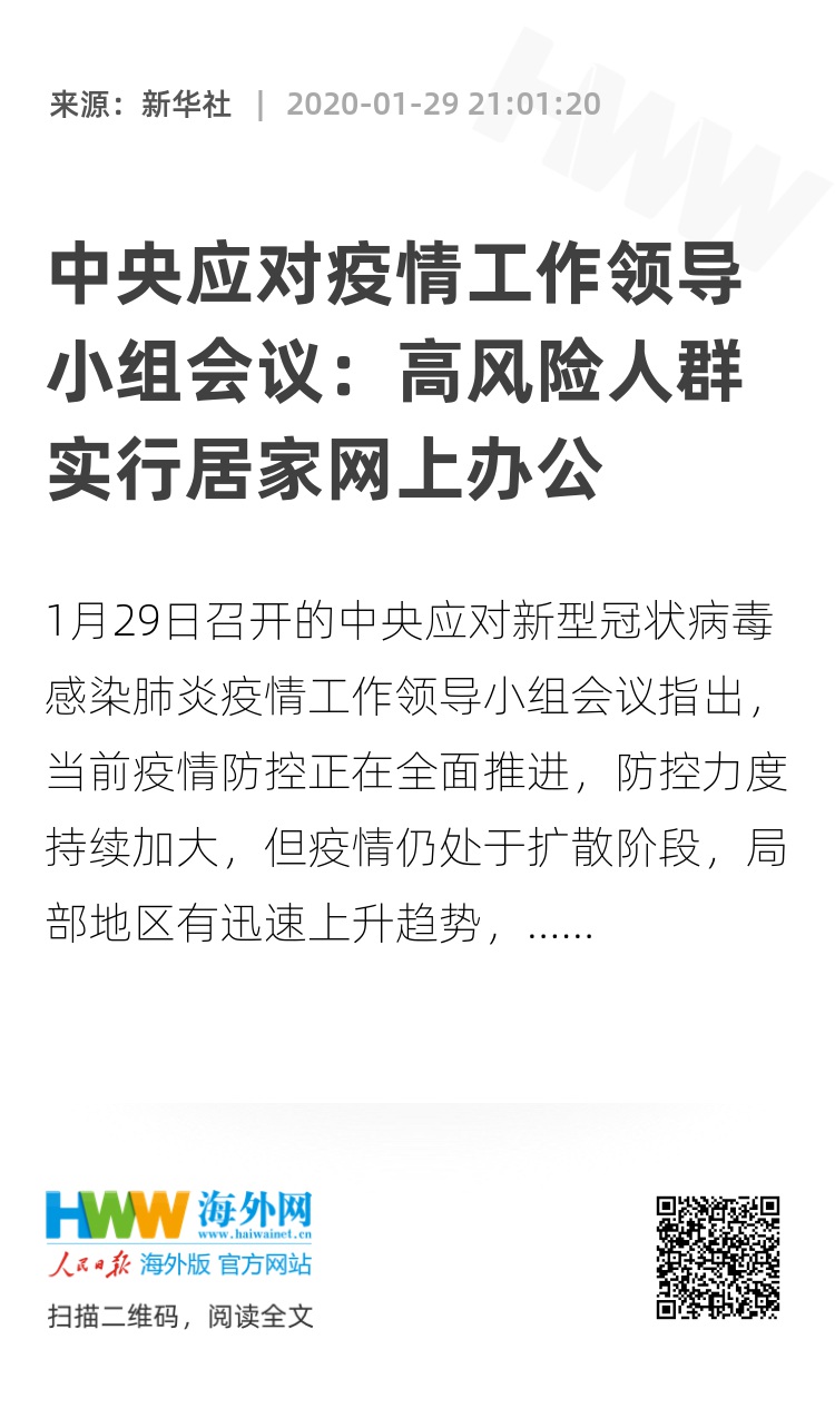 1月29日召开的中央应对新型冠状病毒感染肺炎疫情工作领导小组会议指出,当前疫情防控正在全面推进,防控力度持续加大,但疫情仍处于扩散阶段,局部地区有迅速上升趋势,形势复杂严峻。