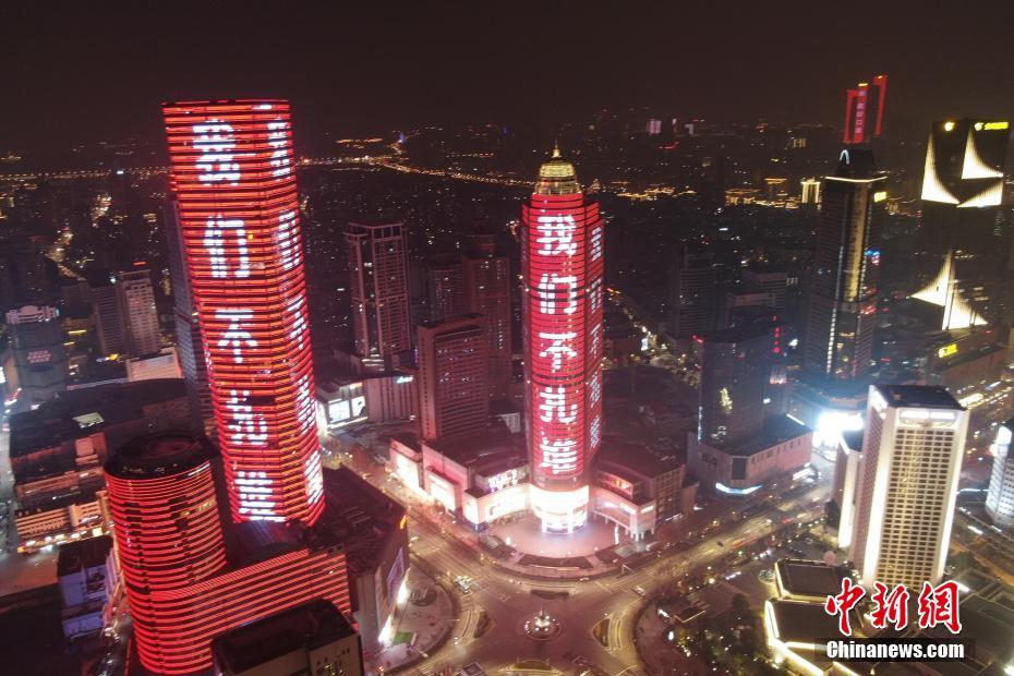 1月28日晚,南京闹市楼宇点亮“武汉加油”“我们一起加油”“戴好口罩”“勤洗手”等防疫标语字样。中新社记者 泱波 摄