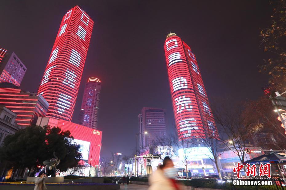 1月28日晚,南京闹市楼宇点亮“武汉加油”“我们一起加油”“戴好口罩”“勤洗手”等防疫标语字样。中新社记者 泱波 摄