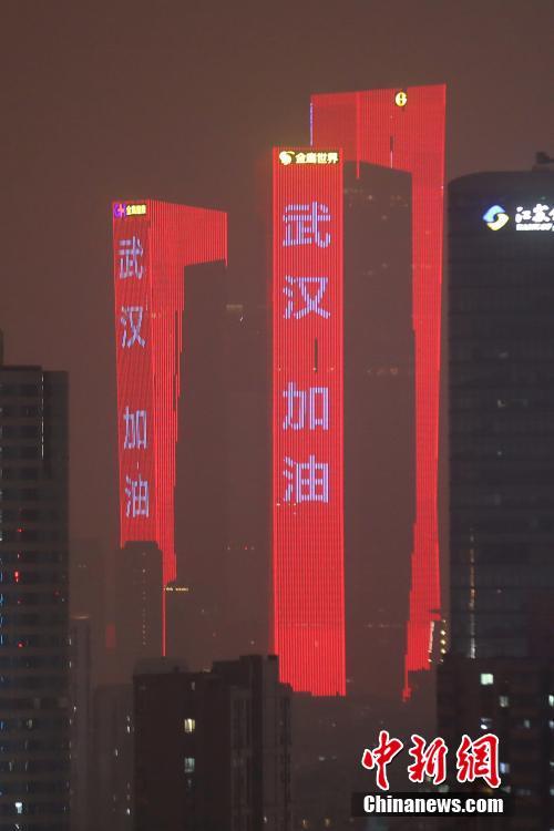 1月28日晚,南京闹市楼宇点亮“武汉加油”“我们一起加油”“戴好口罩”“勤洗手”等防疫标语字样。中新社记者 泱波 摄