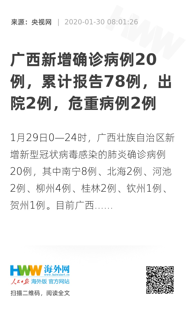 1月29日0—24时,广西壮族自治区新增新型冠状病毒感染的肺炎确诊病例20例,其中南宁8例、北海2例、河池2例、柳州4例、桂林2例、钦州1例、贺州1例。