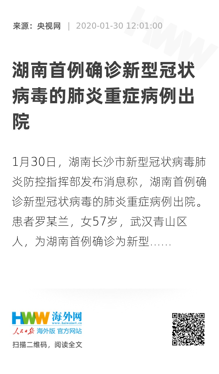 1月30日,湖南长沙市新型冠状病毒肺炎防控指挥部发布消息称,湖南首例确诊新型冠状病毒的肺炎重症病例出院。