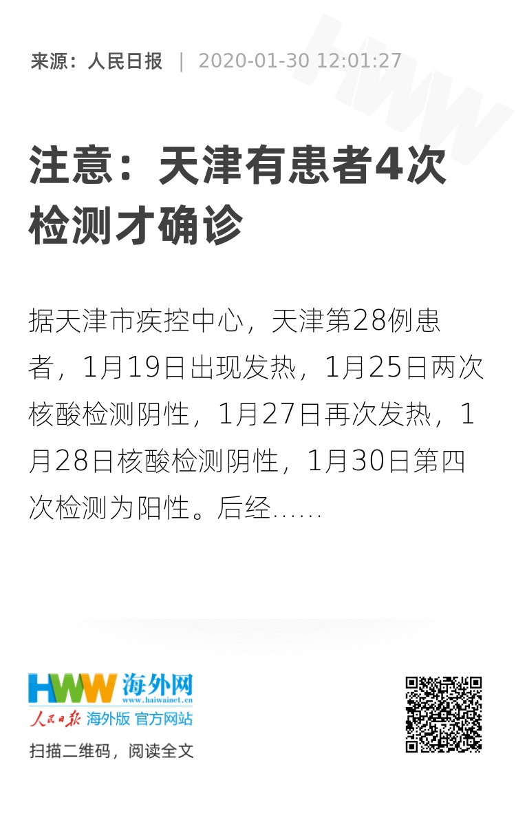 据天津市疾控中心,天津第28例患者,1月19日出现发热,1月25日两次核酸检测阴性,1月27日再次发热,1月28日核酸检测阴性,1月30日第四次检测为阳性。后经市专家组确诊为普通型病例,目前生命体征平稳。