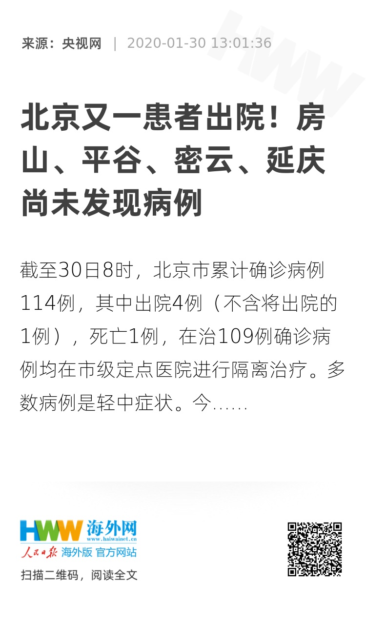 截至30日8时,北京市累计确诊病例114例,其中出院4例(不含将出院的1例),死亡1例,在治109例确诊病例均在市级定点医院进行隔离治疗。多数病例是轻中症状。今天(30日)上午,又有1名患者将出院。