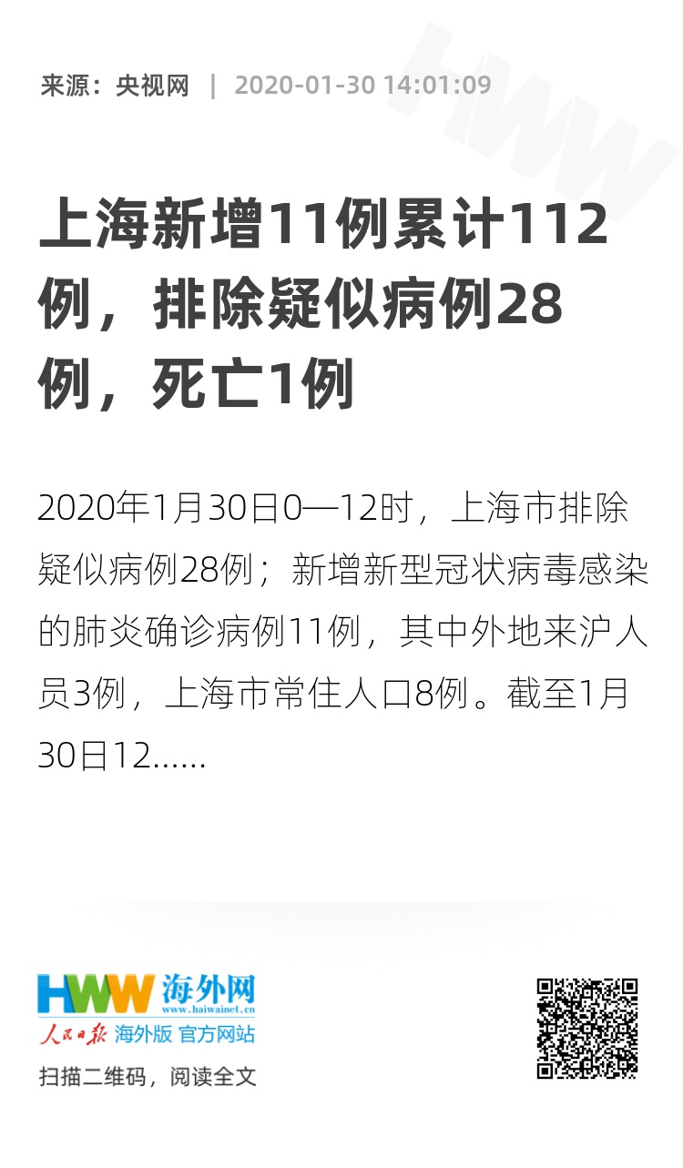 2020年1月30日0—12时,上海市排除疑似病例28例;新增新型冠状病毒感染的肺炎确诊病例11例,其中外地来沪人员3例,上海市常住人口8例。