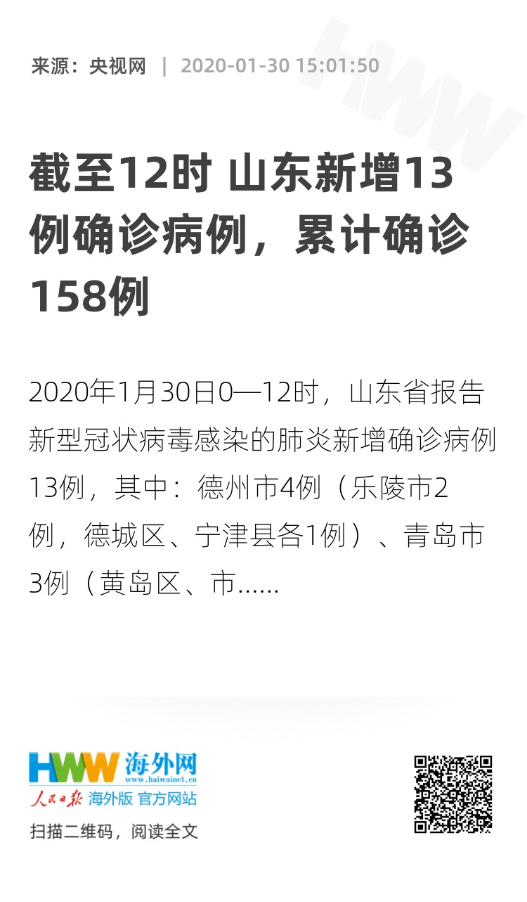 2020年1月30日0—12时,山东省报告新型冠状病毒感染的肺炎新增确诊病例13例,其中:德州市4例(乐陵市2例,德城区、宁津县各1例)、青岛市3例(黄岛区、市北区、即墨区各1例)、淄博市2例(博山区)、滨州市2例(邹平市)、枣庄市1例(滕州市)、日照市1例(岚山区)。