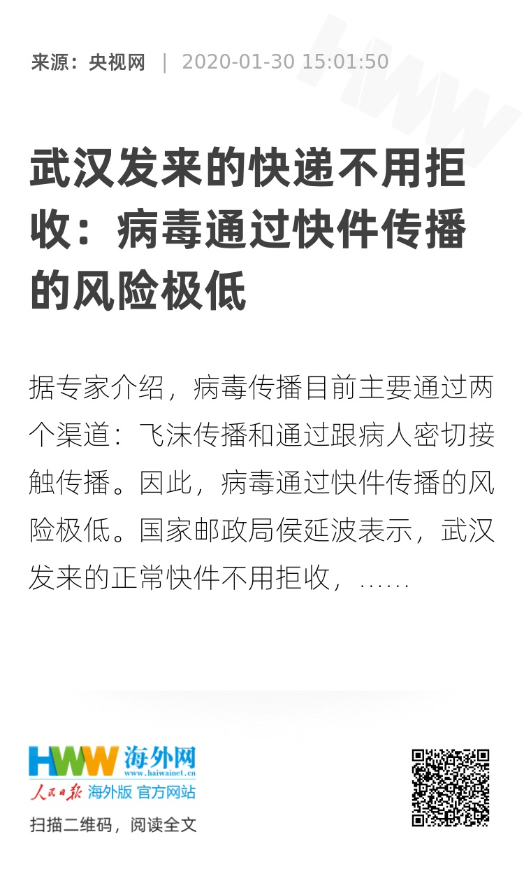 据专家介绍,病毒传播目前主要通过两个渠道:飞沫传播和通过跟病人密切接触传播。因此,病毒通过快件传播的风险极低。国家邮政局侯延波表示,武汉发来的正常快件不用拒收,提醒收完快件请及时洗手。