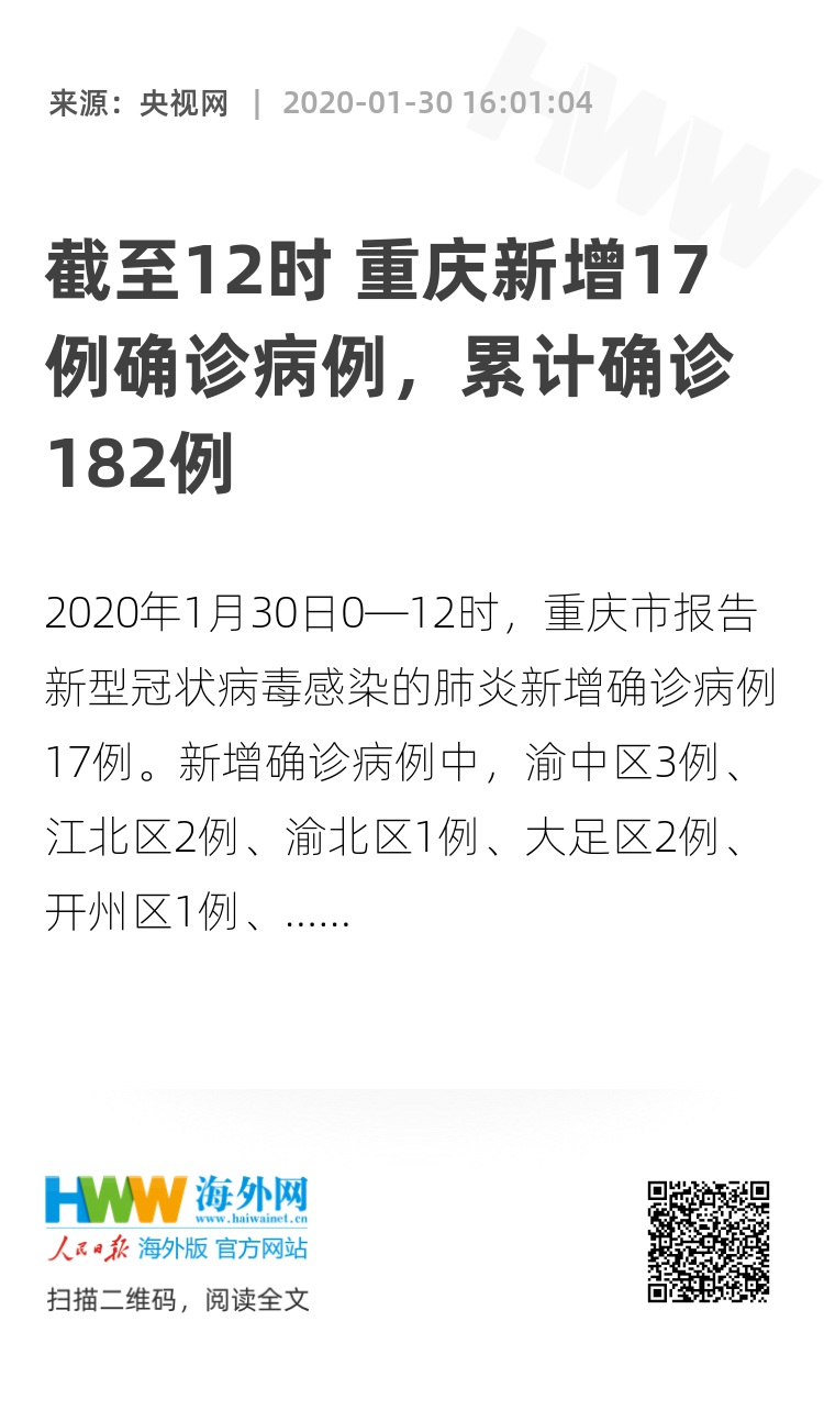 2020年1月30日0—12时,重庆市报告新型冠状病毒感染的肺炎新增确诊病例17例。