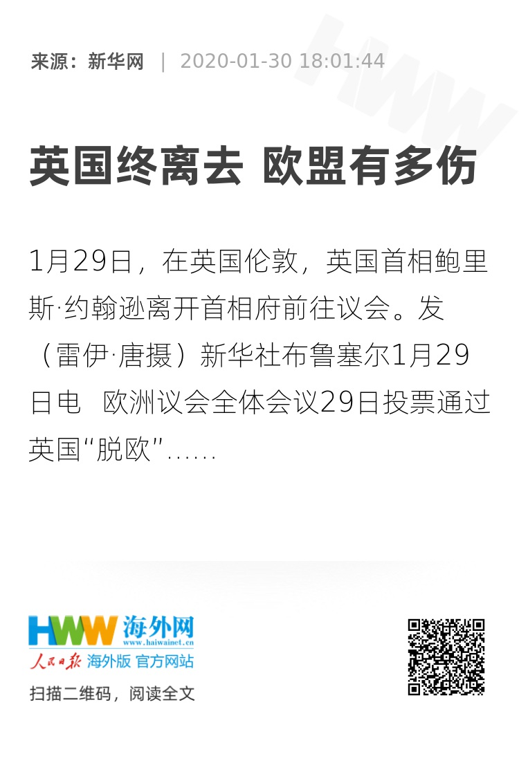 新华社布鲁塞尔1月29日电 欧洲议会全体会议29日投票通过英国“脱欧”协议,使英国脱离欧盟的程序朝最终完结又迈进一步。