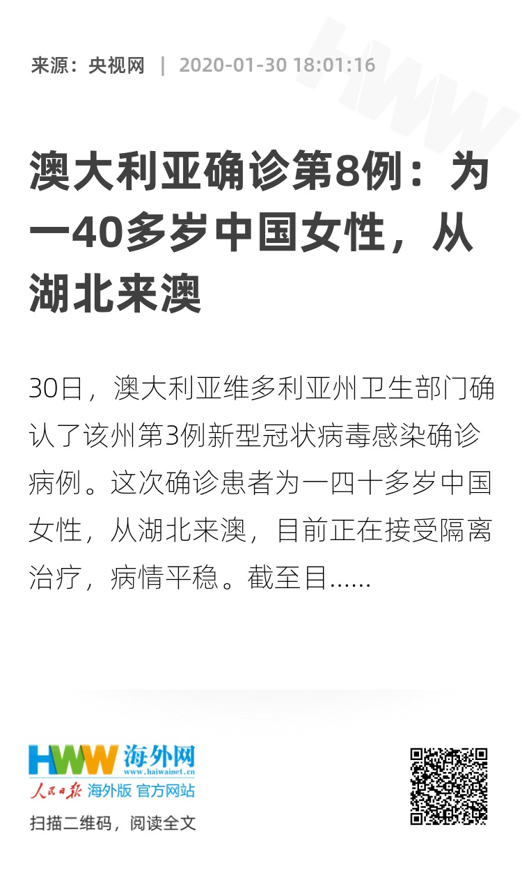 30日,澳大利亚维多利亚州卫生部门确认了该州第3例新型冠状病毒感染确诊病例。这次确诊患者为一四十多岁中国女性,从湖北来澳,目前正在接受隔离治疗,病情平稳。