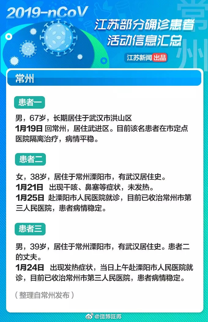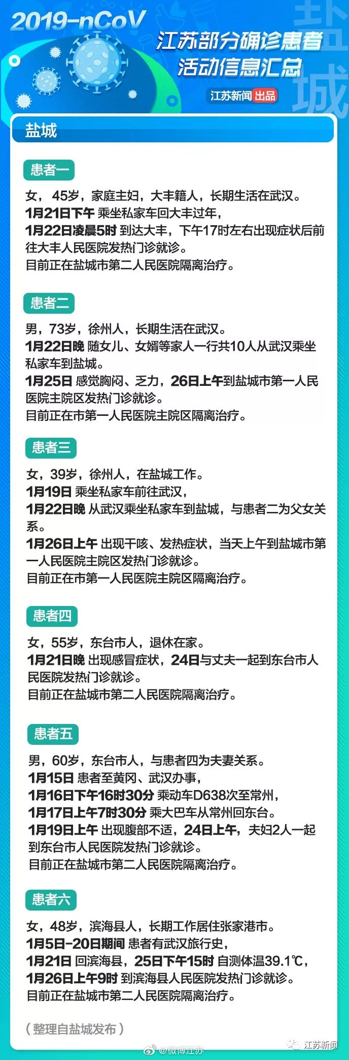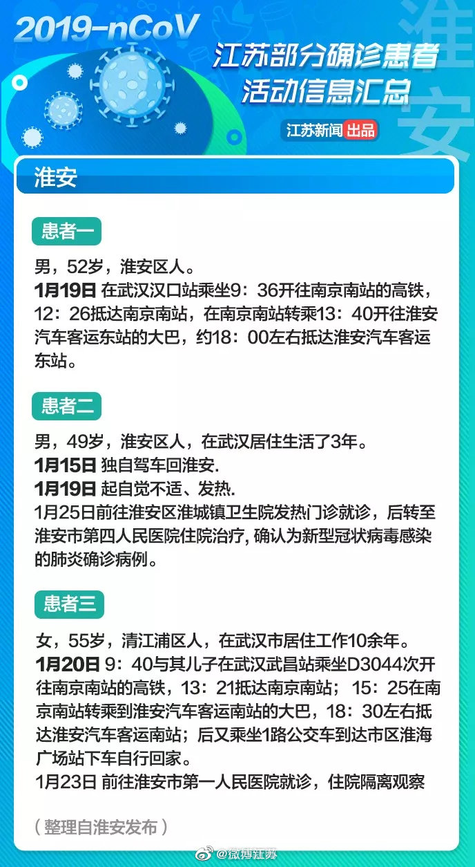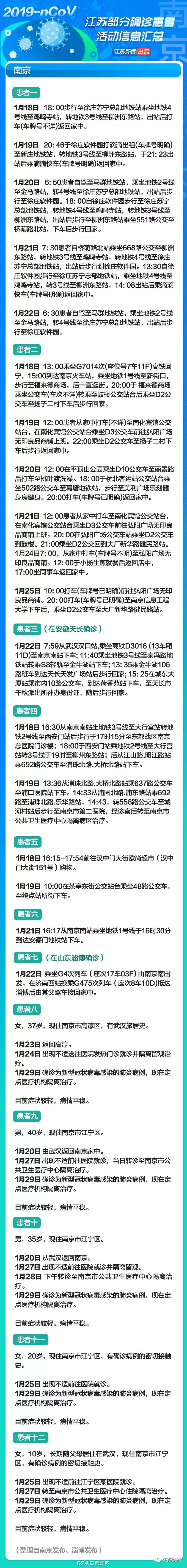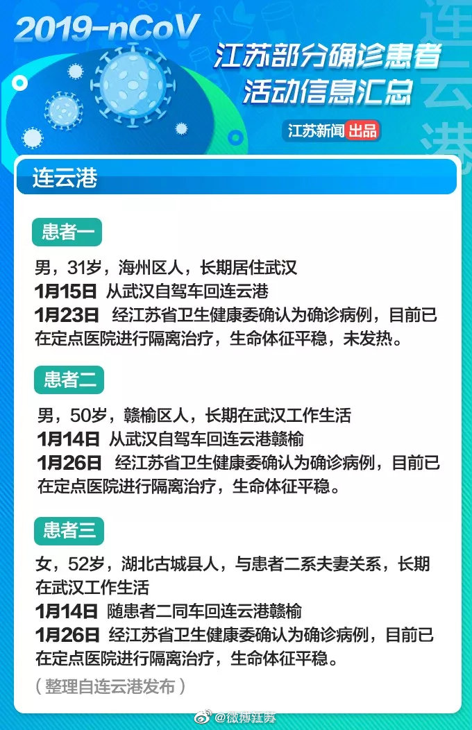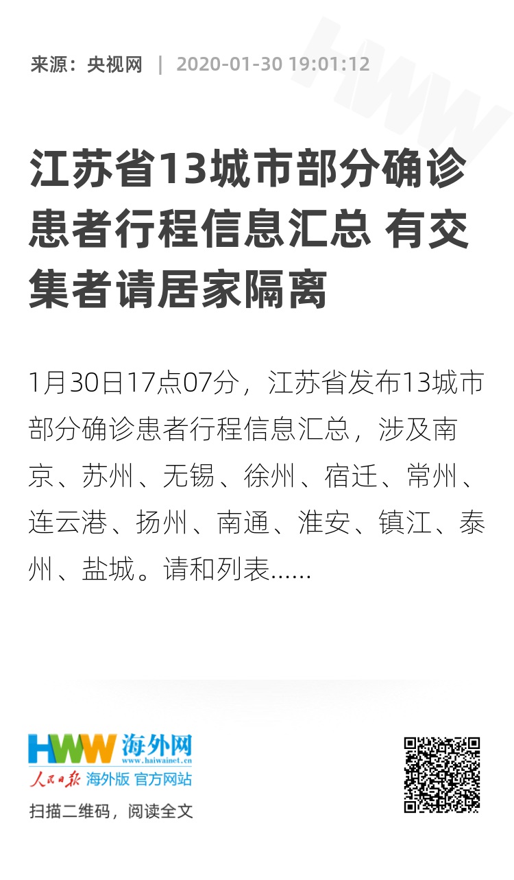 1月30日17点07分,江苏省发布13城市部分确诊患者行程信息汇总,涉及南京、苏州、无锡、徐州、宿迁、常州、连云港、扬州、南通、淮安、镇江、泰州、盐城。请和列表中患者行程有交集的人员返家后暂不要外出,居家封闭隔离观察。发现异常请立即联系当地疾控中心或到当地医院咨询就诊。转发提醒!(总台央视记者 吴睿)