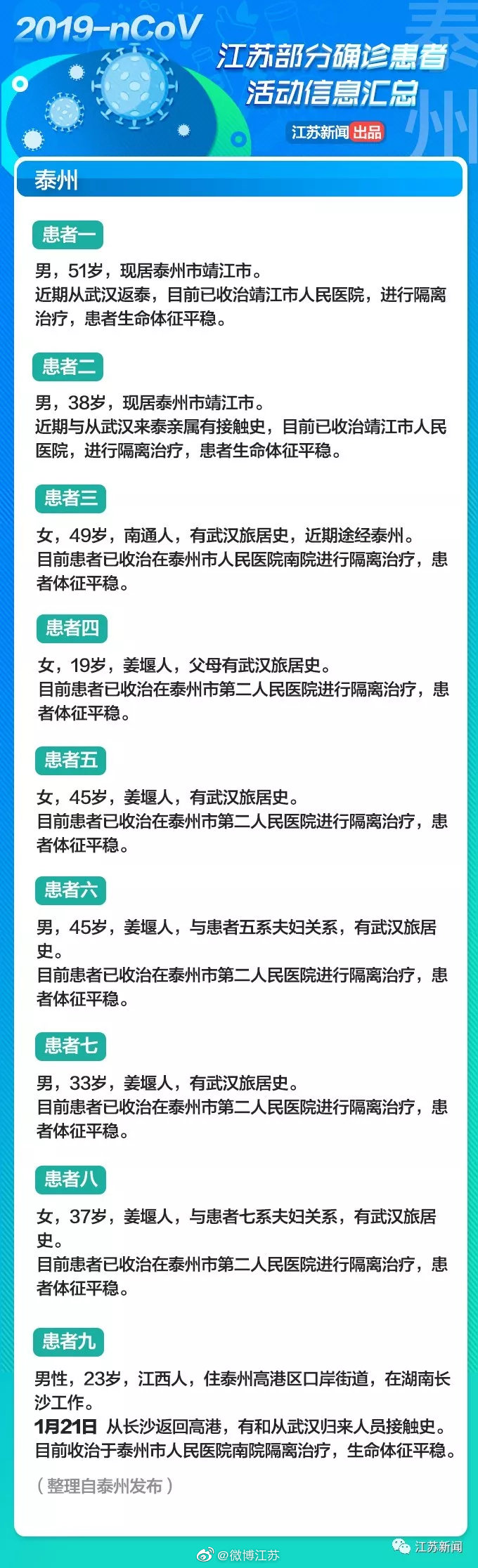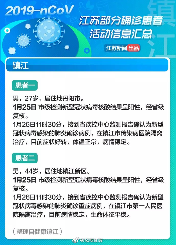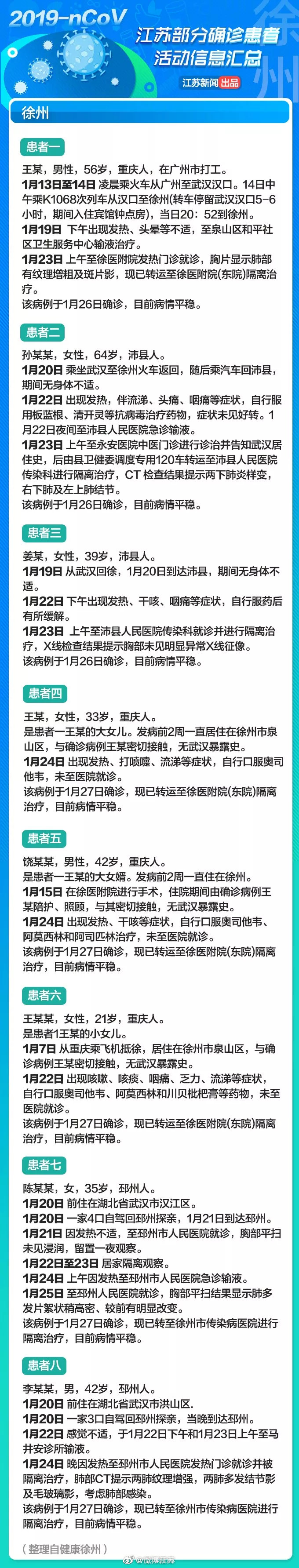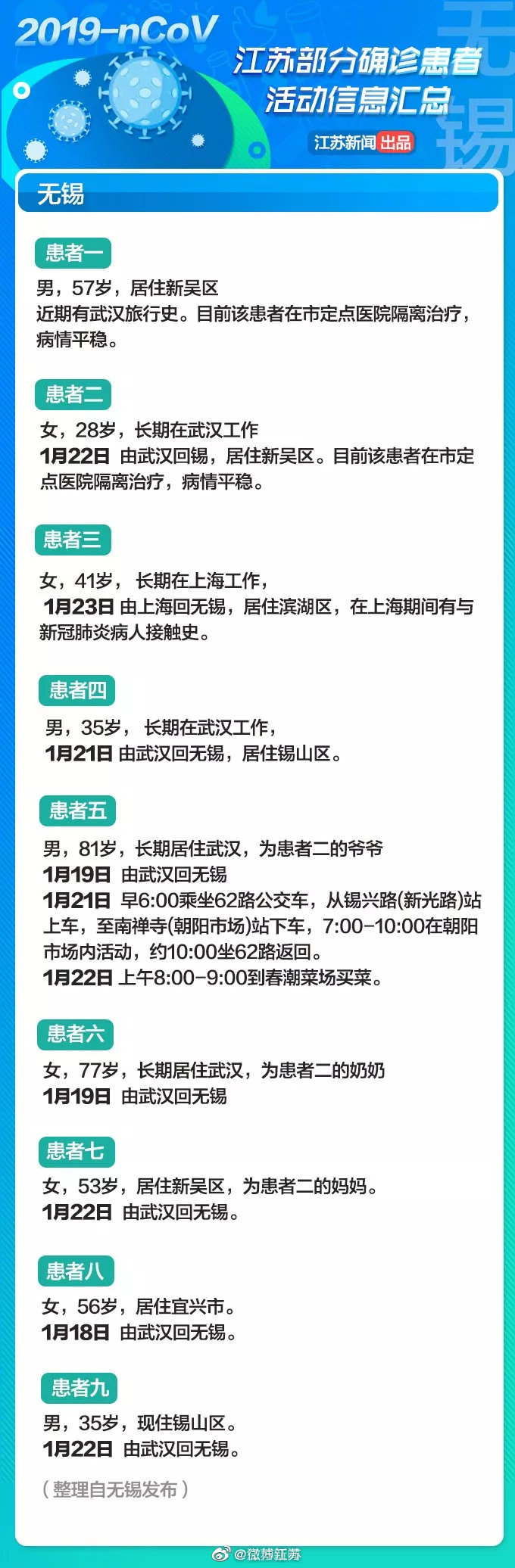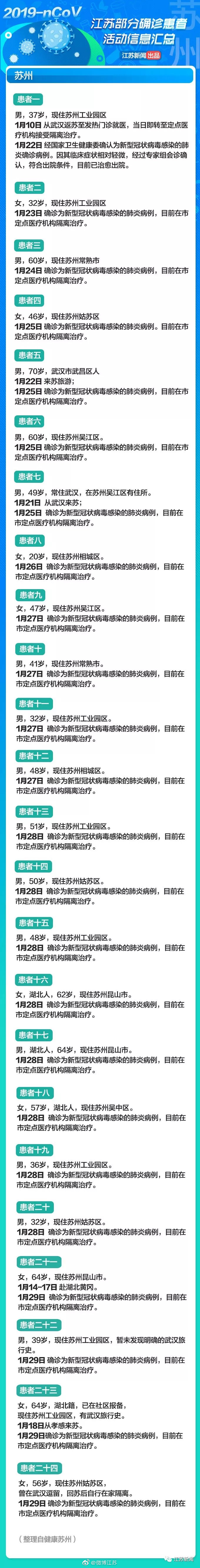 1月30日17点07分,江苏省发布13城市部分确诊患者行程信息汇总,涉及南京、苏州、无锡、徐州、宿迁、常州、连云港、扬州、南通、淮安、镇江、泰州、盐城。请和列表中患者行程有交集的人员返家后暂不要外出,居家封闭隔离观察。发现异常请立即联系当地疾控中心或到当地医院咨询就诊。转发提醒!(总台央视记者 吴睿)