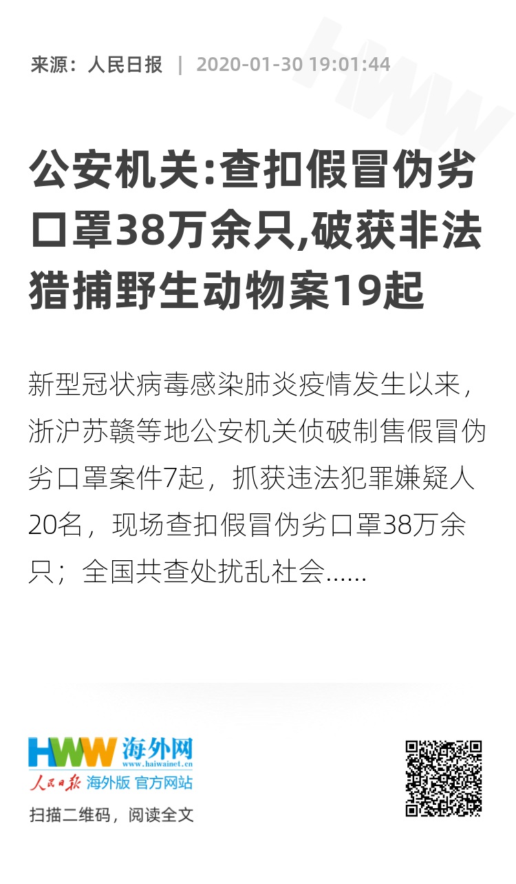 31707498,.公安机关:查扣假冒伪劣口罩38万余只,破获非法猎捕野生动物案19起,.2020-01-30 19:24:44,.204417,.袁如霞