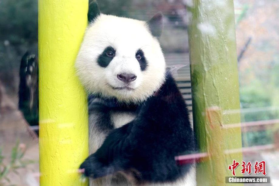 雌性大熊猫“梦梦”站在大熊猫馆内凝视着前来拍摄的媒体记者们,可爱的姿态令人忍俊不禁。中新社记者 彭大伟 摄