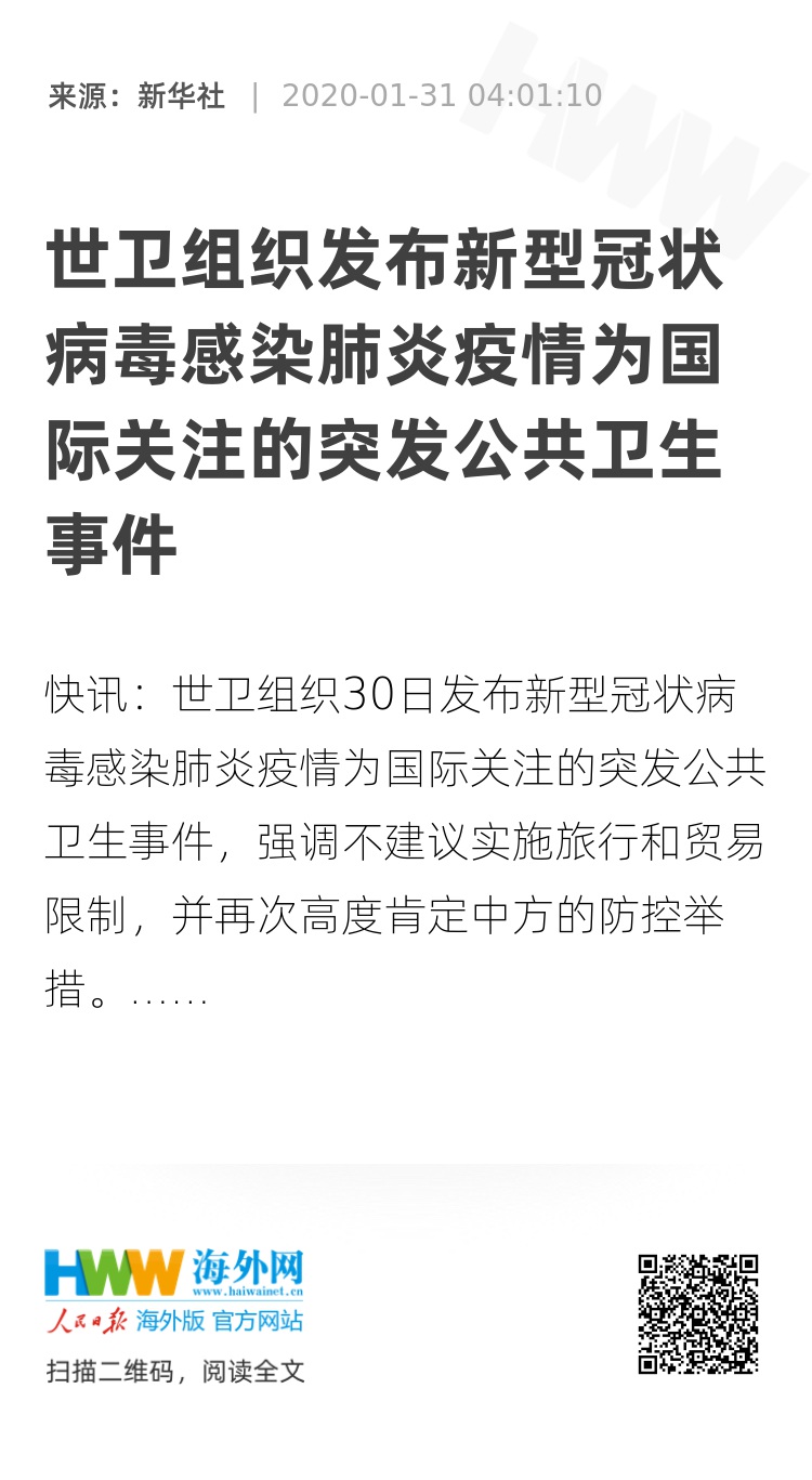 世卫组织30日发布新型冠状病毒感染肺炎疫情为国际关注的突发公共卫生事件,强调不建议实施旅行和贸易限制,并再次高度肯定中方的防控举措。