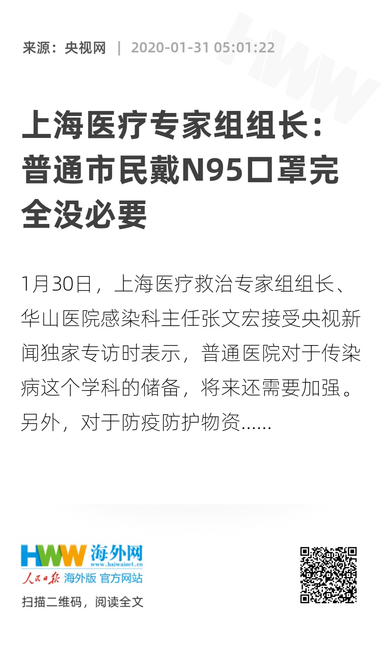1月30日,上海医疗救治专家组组长、华山医院感染科主任张文宏接受央视新闻独家专访时表示,普通医院对于传染病这个学科的储备,将来还需要加强。另外,对于防疫防护物资,政府要统一调配,比如N95口罩,普通市民完全不需要,戴医用外科口罩就够了,N95应该留给医护人员。