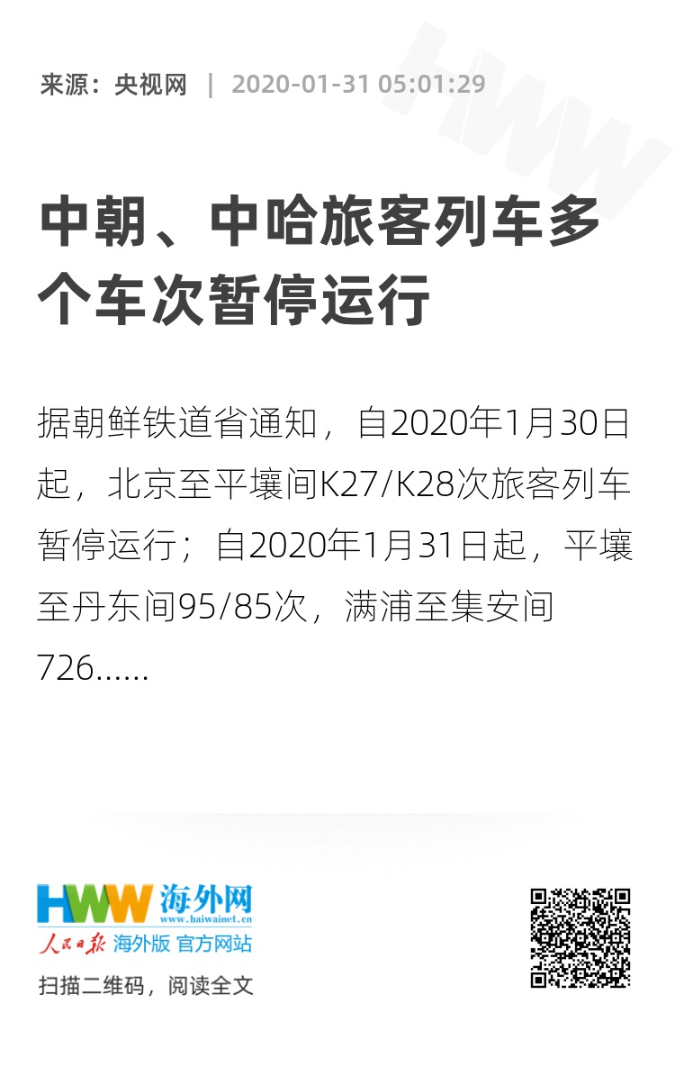 据朝鲜铁道省通知,自2020年1月30日起,北京至平壤间K27/K28次旅客列车暂停运行;自2020年1月31日起,平壤至丹东间95/85次,满浦至集安间7263/8271次旅客列车暂停运行。