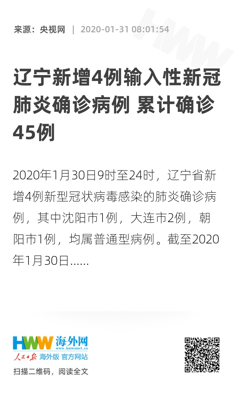 原标题:《辽宁新增4例输入性新型冠状病毒感染的肺炎确诊病例 累计确诊45例》