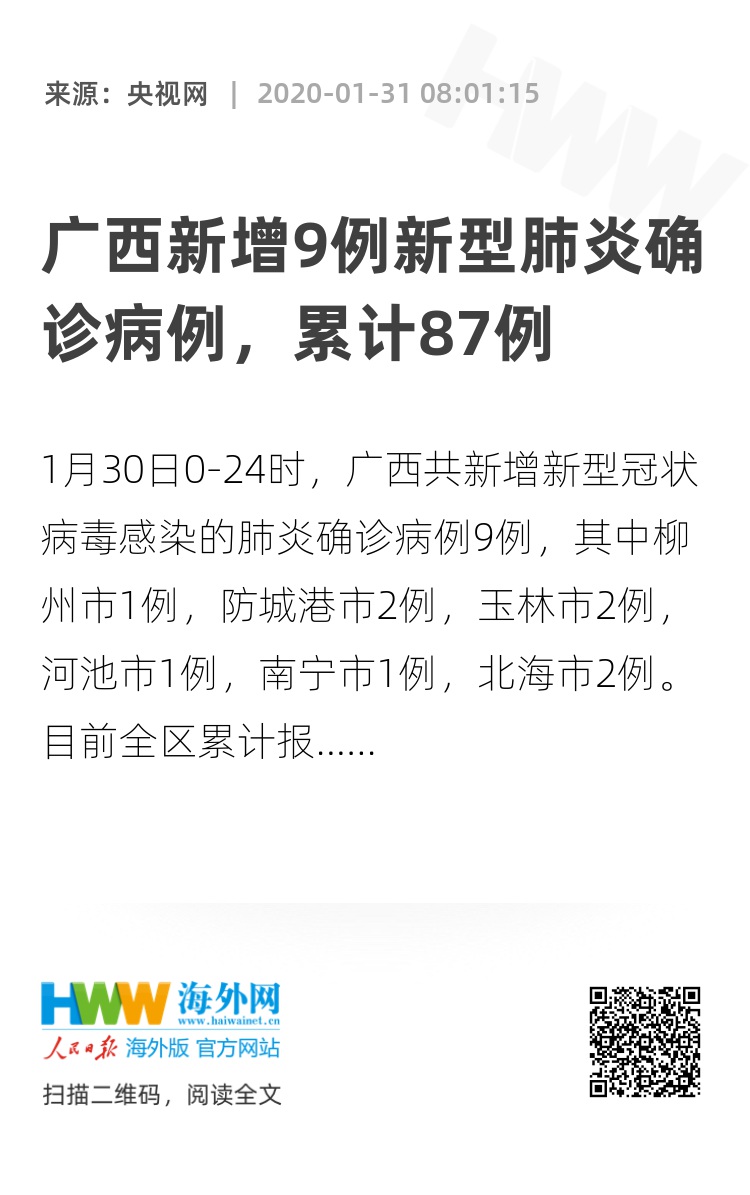 原标题:《广西31日最新通报:新增新型冠状病毒感染的肺炎确诊病例9例》