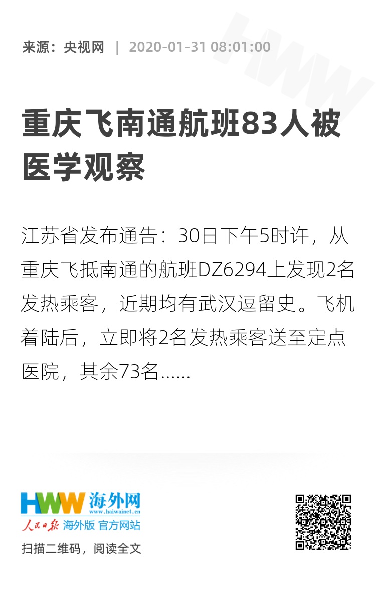 江苏省发布通告:30日下午5时许,从重庆飞抵南通的航班DZ6294上发现2名发热乘客,近期均有武汉逗留史。飞机着陆后,立即将2名发热乘客送至定点医院,其余73名乘客及10名机组成员均实施集中医学观察,后续工作正规范推进。(总台央视记者吴睿)