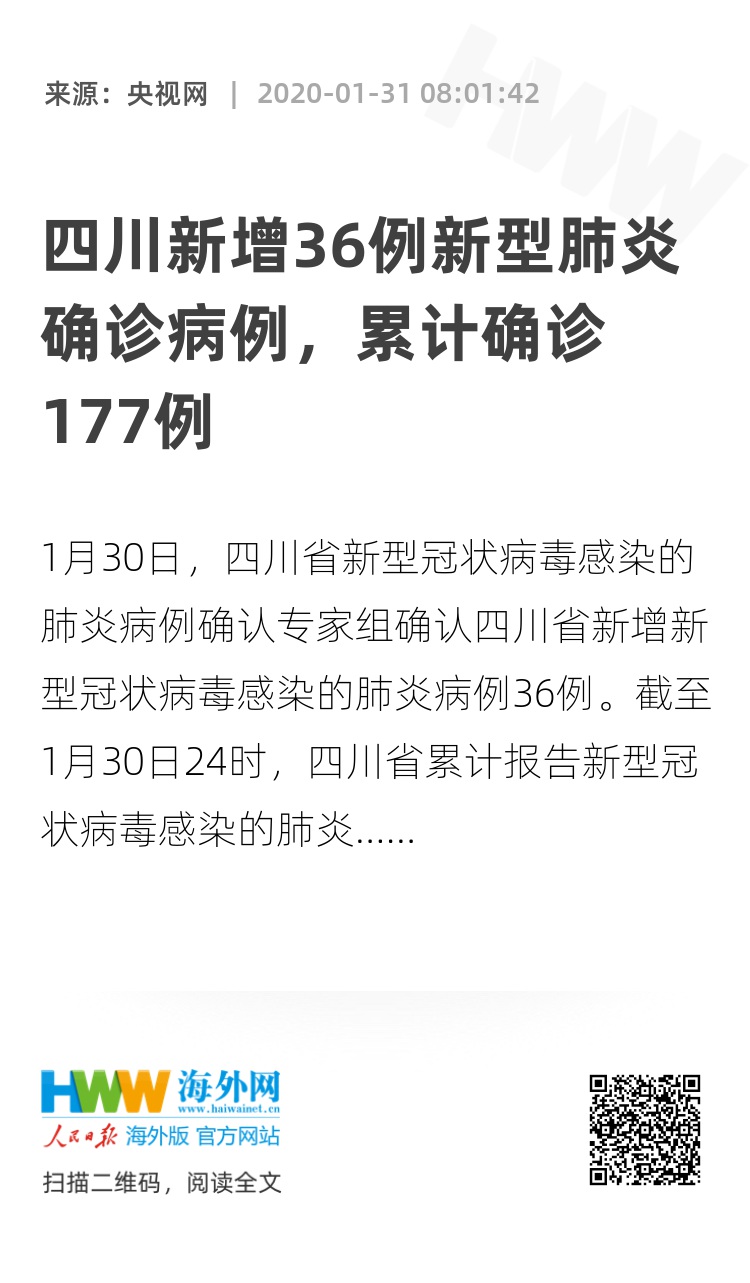 1月30日,四川省新型冠状病毒感染的肺炎病例确认专家组确认四川省新增新型冠状病毒感染的肺炎病例36例。