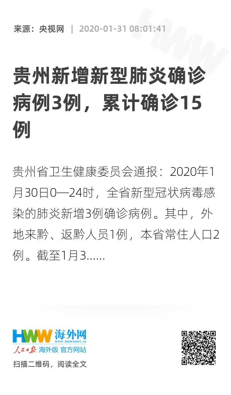原标题:《贵州31日最新通报:新增新型冠状病毒感染的肺炎确诊病例3例 累计确诊15例》