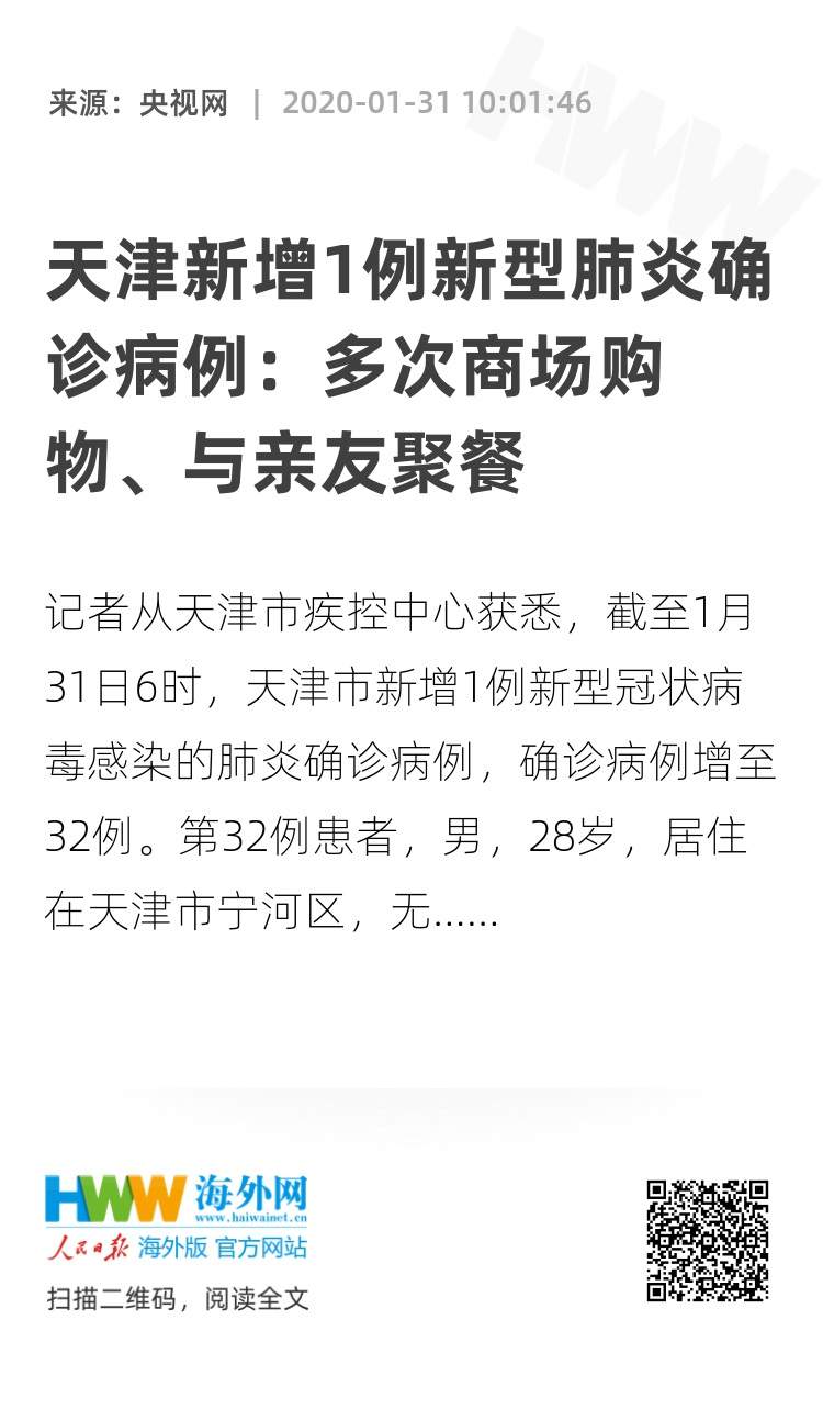 第32例患者,男,28岁,居住在天津市宁河区,无武汉旅游史和工作史。患者于1月20日前到过湛江、南昌、北京等地,20日返回宁河。21日至23日多次与亲友聚餐和商场购物。1月23日患者出现发热等症状,26日就诊于宁河区医院,因血常规和胸片未见异常回家,在社区卫生站继续输液治疗。1月30日因病情加重再次于宁河区医院发热门诊就诊,后经市专家组确诊为我市第32例病例,为重型病例。目前患者已转至海河医院。患者父母和社区卫生站的6人已接受隔离医学观察,疾控部门正按其移动轨迹追踪排查其他密切接触者。