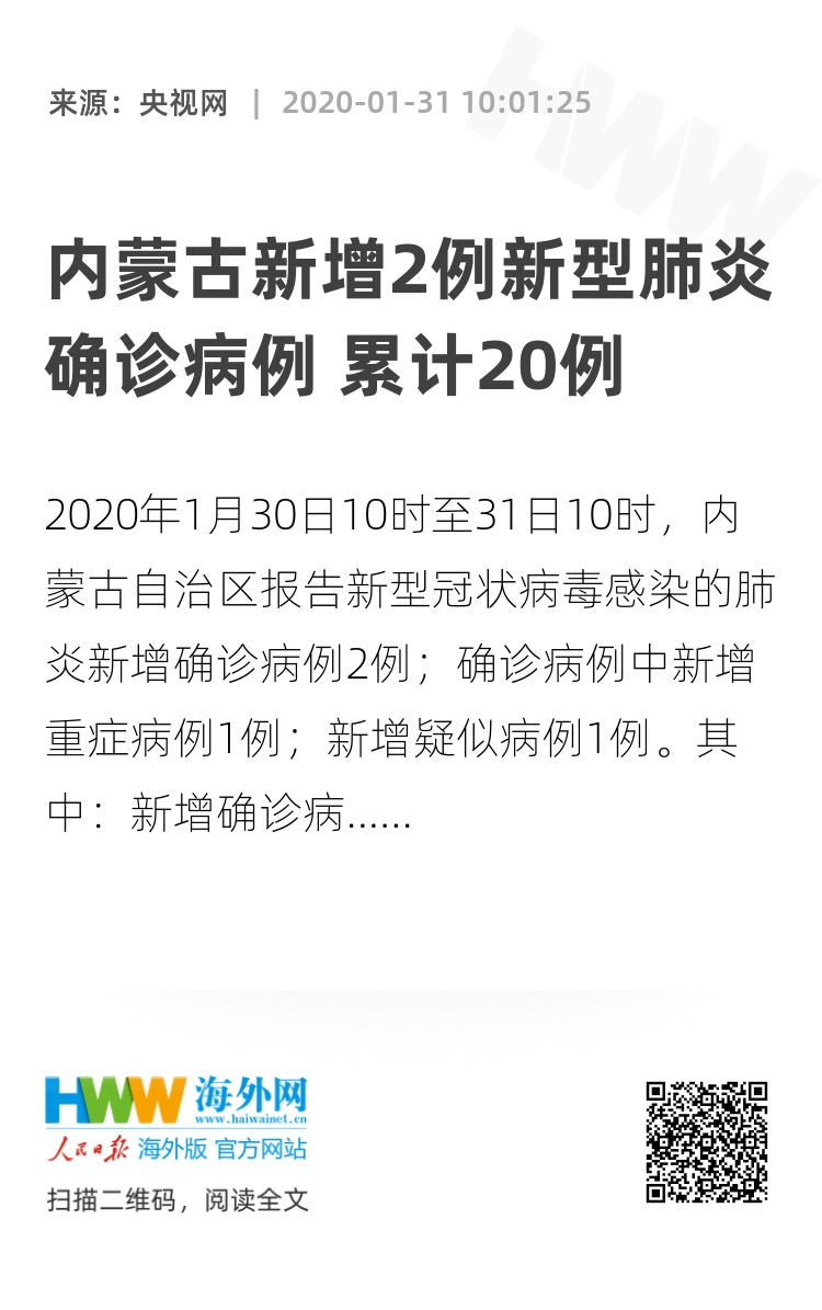 原标题:《内蒙古自治区31日最新通报:新增新型冠状病毒感染的肺炎确诊病例2例 累计确诊20例》