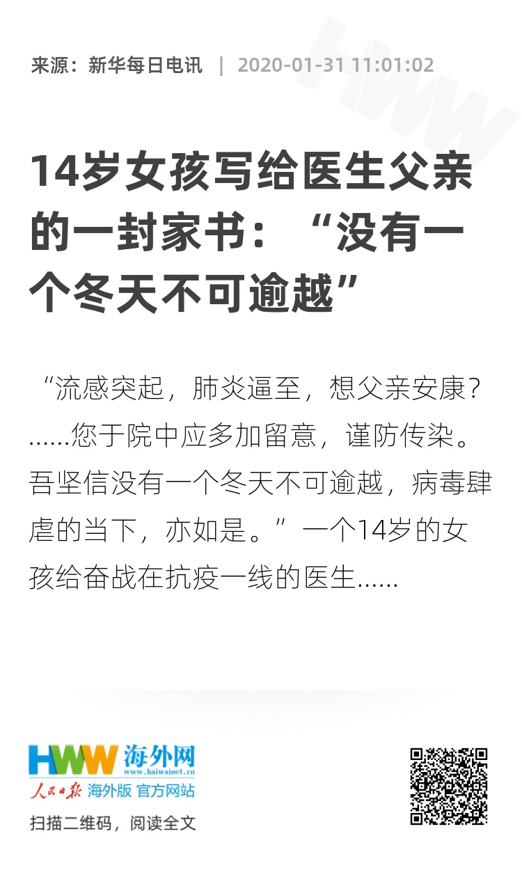 一个14岁的女孩给奋战在抗疫一线的医生父亲写了一封家书。她已经好多天没见到爸爸了。