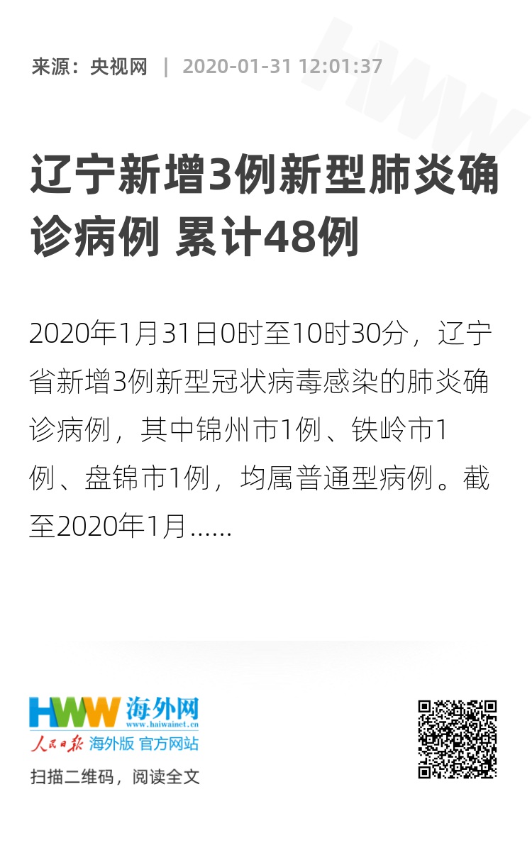 2020年1月31日0时至10时30分,辽宁省新增3例新型冠状病毒感染的肺炎确诊病例,其中锦州市1例、铁岭市1例、盘锦市1例,均属普通型病例。