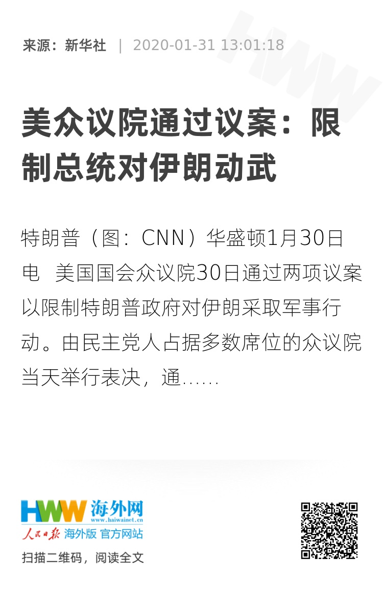 众议院于1月9日已通过一项旨在限制总统对伊朗动武权力的决议,但该决议没有法律约束力。特朗普政府和共和党人称该决议是一个“政治举动”。(记者 刘品然 刘晨)